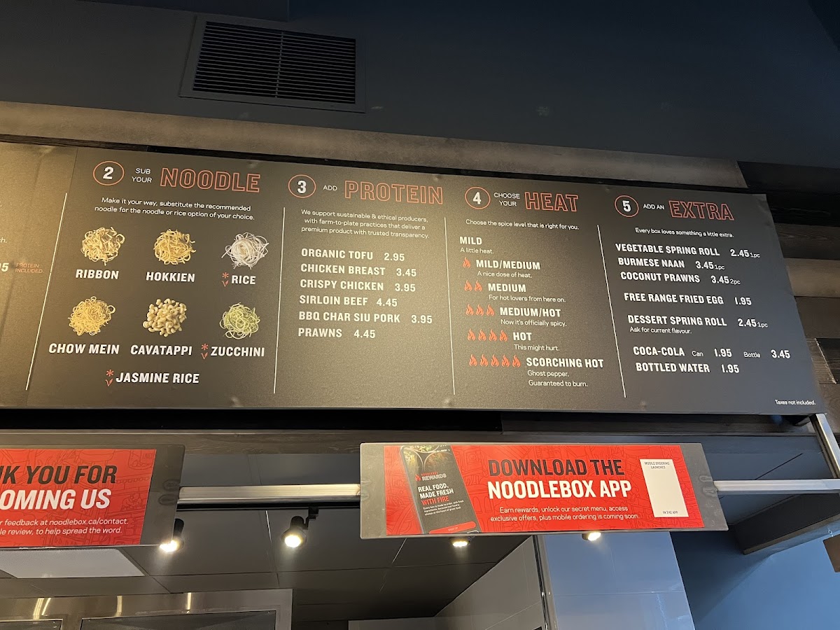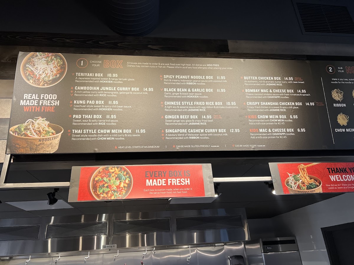 Went for brunch with my mom, we ordered the spicy peanut coconut box, kids mac and cheese (we got some spice added) and chicken bites. The spicy peanut box was 10/10, amazing. Flavour was spot on and so was the spice it was packed with veggies and we both loved it. The mac and cheese sauce was not thick, very cheesy and spicy because we got some added. This was probably one of the best mac and cheese i’ve have in the area. The chicken bites were well coated however there wasn’t much flavour in them so I wouldn’t recommend unless it’s for children. The service WAS quick, the bites arrived before my mom even settled down after ordering and the boxes arrived 5-7 minutes after that. Overall good experience, I would recommend noodle box!